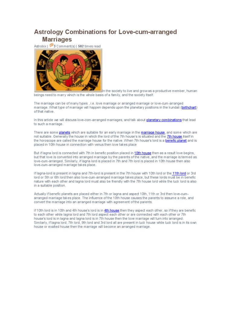 Vedic Astrological Combinations for Love Marriage - Astrobix.com The chances of a love marriage are present when Moon is present in Taurus, Scorpio, Capricorn and Pisces sign. On the other hand, if a person is in love with a ... › astrology › marriageMarriage Astrology | Love Marriage or Arranged Marriage ... As per Vedic astrology, there are several factors that influence the timing of a person’s marriage and chart the course of the married life. When it comes to marriage and marital life, the Marriage Calculator helps you find out how the various planetary influences related to marriage in your chart shape your marital life.