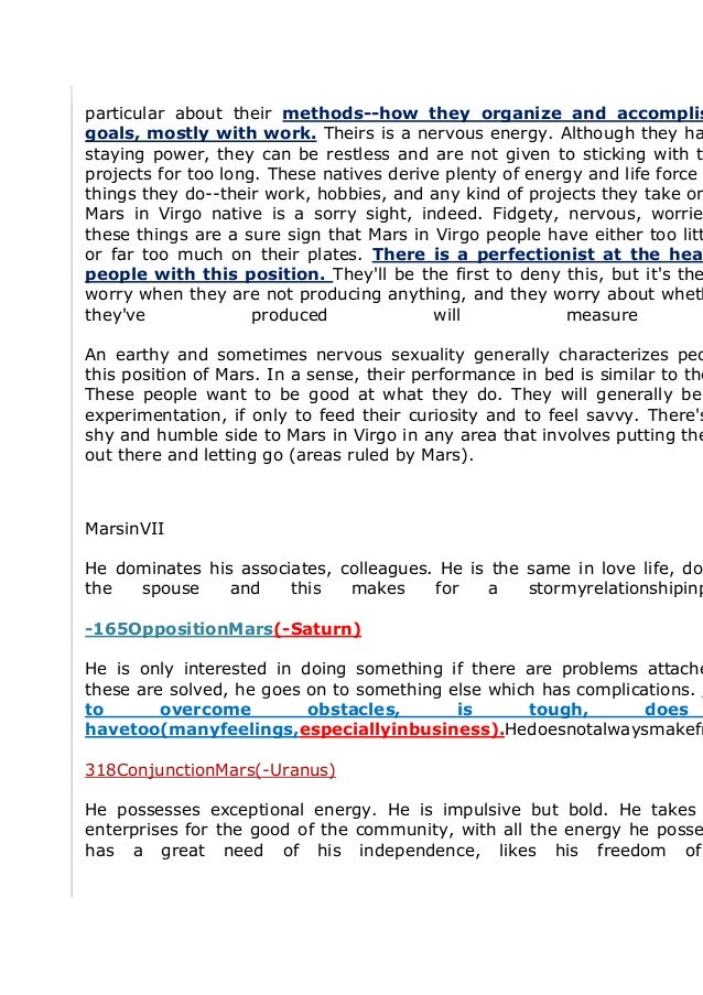 Astrology Love and Sex Secrets Venus/Mars The placement of Mars in a natal chart reveals what motivates and energizes individuals, how they express their drive, what they want, and how they go about ...