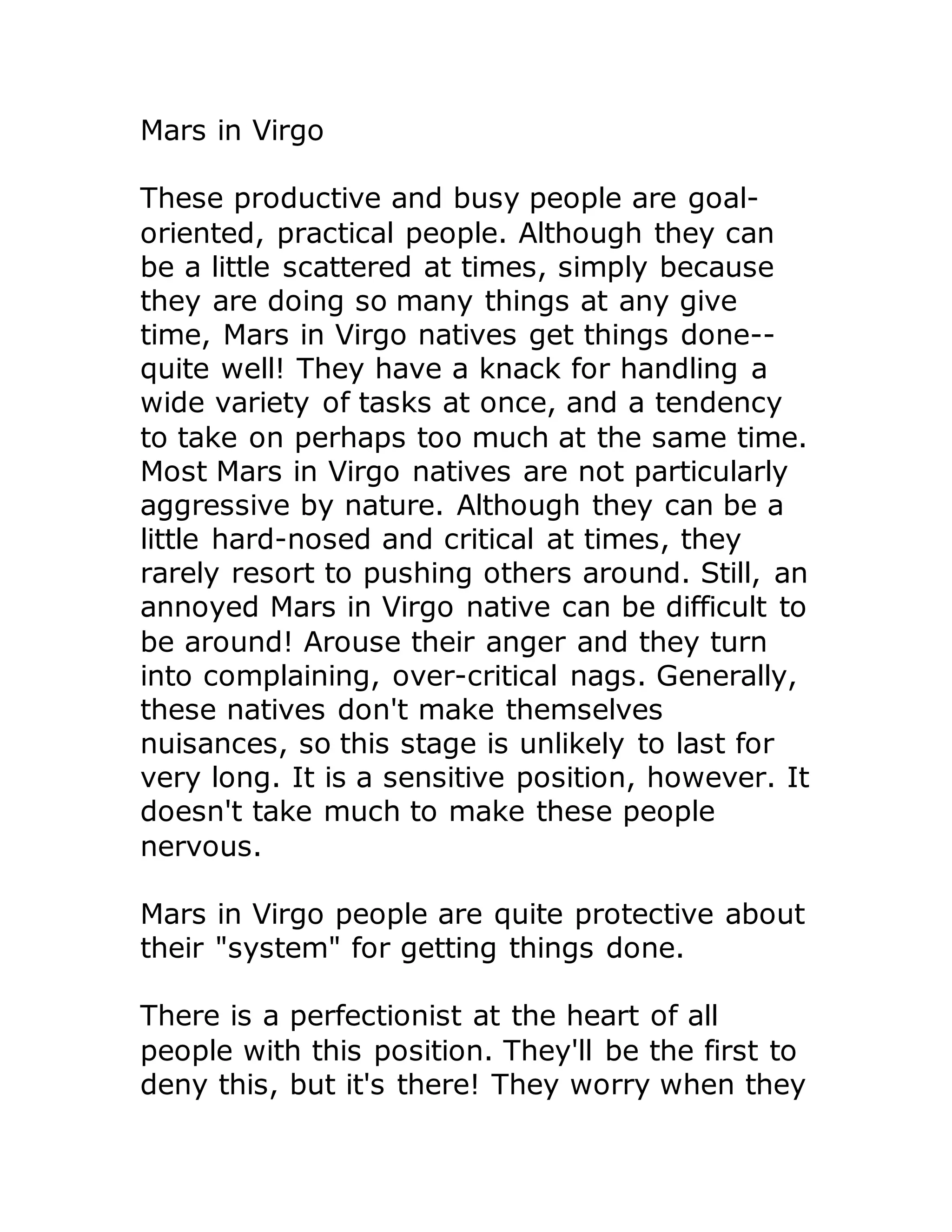 Mars in the Elements | Cafe Astrology .com Mars in Fire people (that is, those with Mars in Aries, Leo, or Sagittarius) are generally quite passionate. When they get angry, those around them generally ...